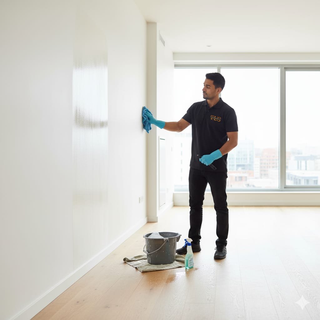 • Step 5: Rinsing & Buffing The walls are wiped with a clean, damp cloth to remove any detergent residue and then buffed dry with high-absorbent microfiber towels to ensure a perfectly uniform, streak-free finish.