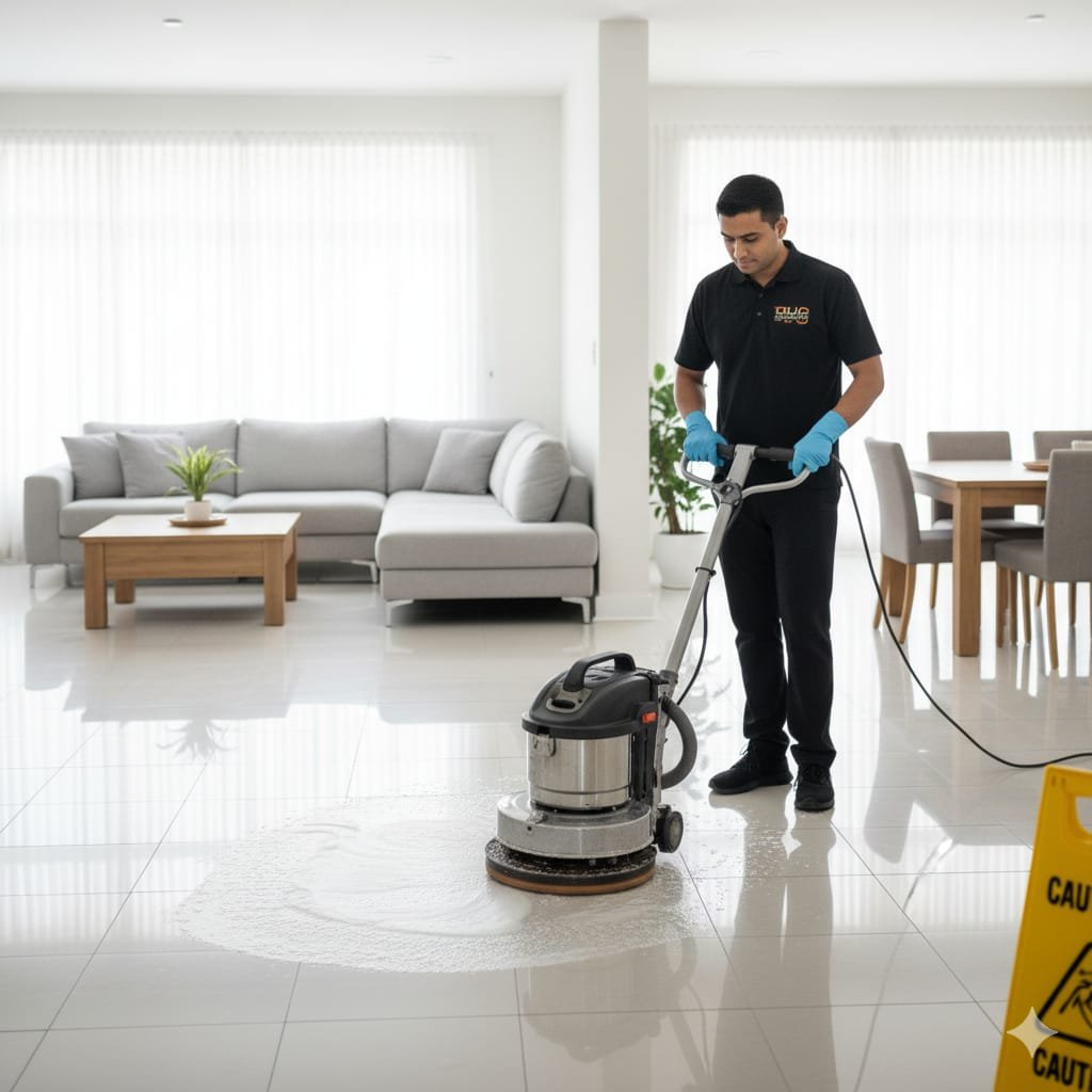 Floors: Professional deep scrubbing using an Industrial Single Disk Machine to restore floor luster, followed by thorough vacuuming of corners.